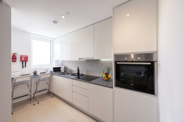 The flat comes with an inventory of items and white goods (fridge, freezer, dishwasher, washing machine, hob, oven, microwave, kettle, toaster, iron).